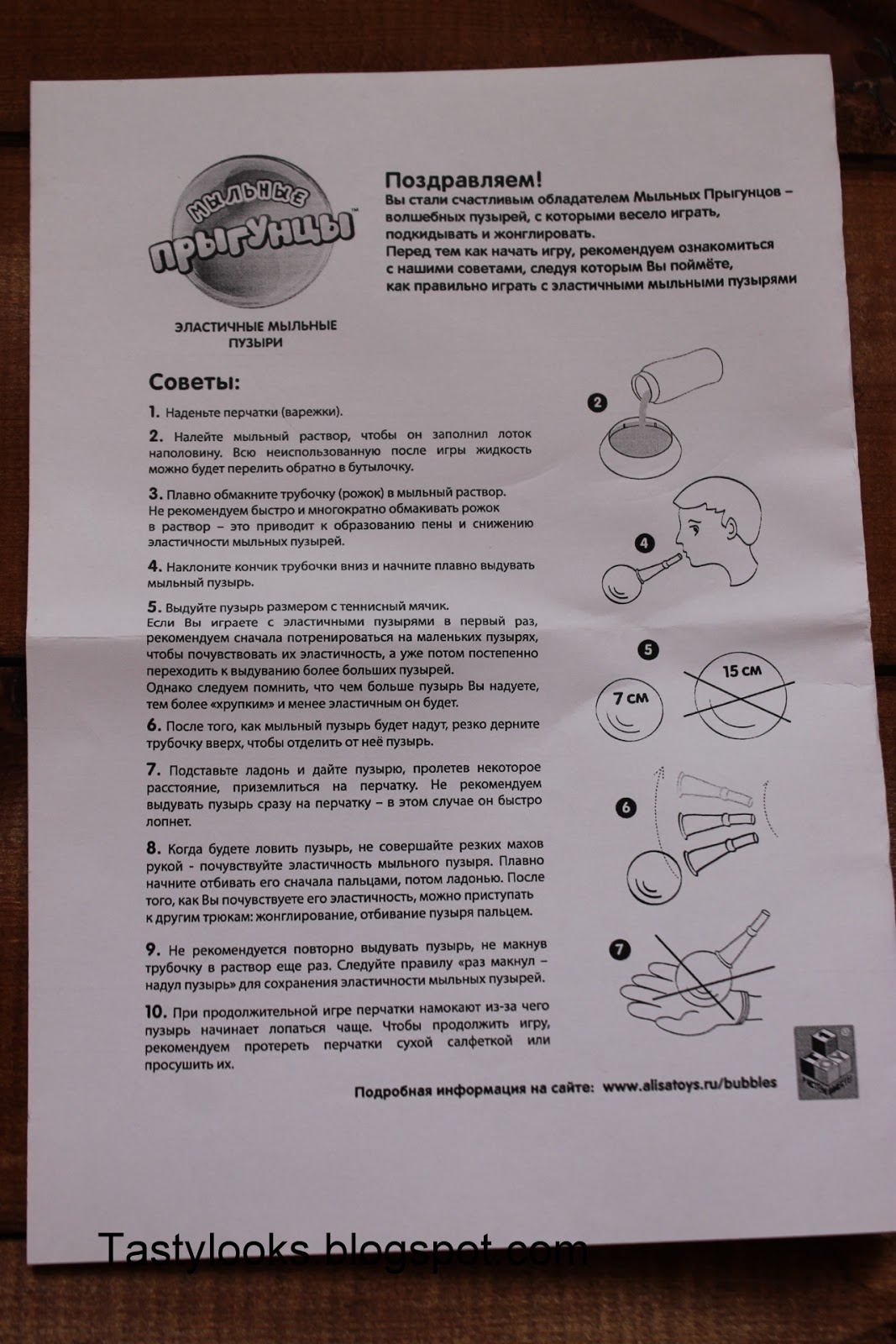 Итак, в чем отличительные особенности этих пузырей? В комплекте, как вы видите, находится мыльный раствор, импровизированная тарелочка, куда все наливается, и сам инструмент для выдувания. Но есть еще и пара перчаток. Так вот, для того, чтобы пузыри не лопнули, нужно ловить их именно в перчатках! Думается мне, что и мыльный раствор какой-то особенный, хотя при использовании не была замечена какая-то невероятная плотность пузырей, например. Если ловить их руками, то они лопаются, как и обычные пузыри.
